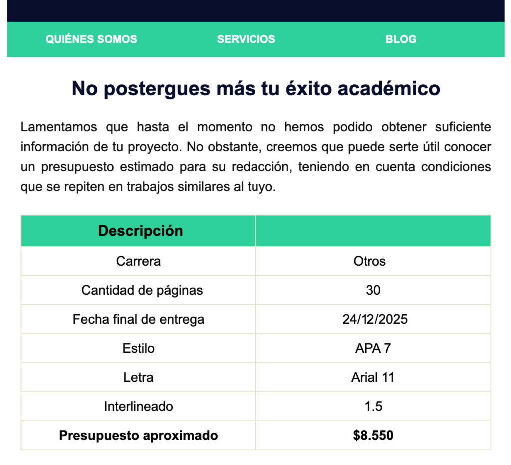 Además, el uso de campañas en TikTok para captar clientes jóvenes refuerza la percepción de que el negocio está dirigido principalmente a universitarios en busca de soluciones rápidas, más que a un verdadero acompañamiento académico.